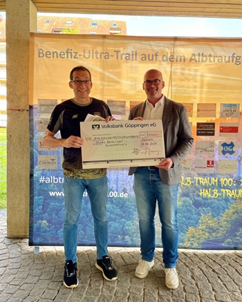 Foto (Stadtverwaltung Geislingen an der Steige / Teresa Christmann): Dr. Marco Höpfner vom Alb-Traum100-Team und Oberbürgermeister Frank Dehmer bei der Spendenübergabe