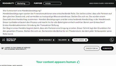 Erstes Handelsabkommen: Gründung der Transaktion StiftungDer Beginn eines Handels beginnt damit,dass alle Parteien eine Einigung erzielen. Dieser Schritt legt den Grundstein für den gesamten Prozess. Stellen Sie sich vor,Sie bereiten die Bühne für ein Theaterstück,bei dem jeder Schauspieler seine Rolle kennt.Händler und Makler besprechen und finalisieren die Bedingungen. Sie vereinbaren Preis,Menge und andere Einzelheiten. Dies ist ein entscheidender Schritt,da jedes Missverständnis hier später zu Problemen führen kann.Stellen Sie sich vor,Sie würden dem Kauf eines Autos zustimmen,ohne vorher den Preis zu besprechen – Sie würden wahrscheinlich in eine schwierige Situation geraten! Hier ist Klarheit der Schlüssel zur Vermeidung von Verwirrung auf der ganzen Linie.Erfassung und Validierung von Handelsdaten: Gewährleistung der GenauigkeitSobald die erste Vereinbarung getroffen ist,ist die Erfassung und Validierung der Handelsdaten der nächste Schritt. Dazu gehört die Aufzeichnung aller zuvor besprochenen Details. Es ist,als würde man ein Rezept aufschreiben,nachdem man sich entschieden hat,was man kochen möchte.Zu diesen Daten gehören der Preis,die Menge und einige weitere vereinbarte Konditionen. Eine Überprüfung ist unerlässlich,um sicherzustellen,dass alles übereinstimmt. Fehler in dieser Phase können kostspielig sein.Stellen Sie sich das wie das Versenden einer Textnachricht vor – Sie überprüfen die Nummer des Empfängers noch einmal,um zu vermeiden,dass sie an die falsche Person gesendet wird. Die Genauigkeit stellt hier einen reibungslosen Ablauf des Handels sicher.Generierung von Handels Bestätigungen: Erstellen des DokumentsNach der Datenerfassung ist es an der Zeit,das Handelsbestätigung Dokument zu erstellen. Dieses Dokument ist eine formelle Aufzeichnung des Handels. Stellen Sie es sich wie eine Quittung vor,die Sie nach dem Einkauf erhalten und in der genau aufgeführt ist,was Sie gekauft haben.Es enthält alle Handels Details und stellt sicher,dass beide Parteien auf dem gleichen Stand sind. Das Dokument muss klar und präzise sein und darf keinen Raum für Zweifel lassen.Stellen Sie sich vor,Sie erhalten eine Restaurantrechnung mit vagen Angaben – das ist frustrierend! Eine gut ausgearbeitete Bestätigung hilft,Streitigkeiten vorzubeugen und das Vertrauen zwischen den Parteien aufrechtzuerhalten.Verteilung von Handels Bestätigungen: Sicherstellung einer pünktlichen LieferungSobald das Bestätigungsdokument fertig ist,muss es mit den beteiligten Parteien geteilt werden. Es ist,als würde man Einladungen zu einer Party verschicken – man möchte,dass jeder die Details kennt.Eine rechtzeitige Lieferung ist von entscheidender Bedeutung,da Verzögerungen zu Unsicherheit oder sogar Streitigkeiten führen können. Moderne Systeme nutzen häufig elektronische Methoden zur schnellen Verteilung.Stellen Sie sich Folgendes vor: Auf einen Brief warten oder sofort eine E-Mail erhalten. Eine schnelle Lieferung trägt dazu bei,die Dynamik des Handels aufrechtzuerhalten und alle Parteien auf dem Laufenden zu halten.Bestätigung und Versöhnung: Gewährleistung der gegenseitigen EinigungIm nächsten Schritt bestätigen beide Parteien die Handels Details. Stellen Sie sich das so vor,als würden Sie Ihre To-Do-Liste noch einmal mit einem Freund überprüfen,dass nichts übersehen wird.Dieser Schritt stellt sicher,dass sich beide Seiten über die Bedingungen einigen. Beim Abgleich geht es darum,die internen Aufzeichnungen mit der erhaltenen Bestätigung abzugleichen.Sollten Unstimmigkeiten auftreten,müssen diese zeitnah behoben werden. Es ist,als würde man sein Scheckbuch ausgleichen – alles muss stimmen. Dieser Schritt ist für die Aufrechterhaltung der Genauigkeit und des Vertrauens in den Handelsprozess von entscheidender Bedeutung.AbschlussDas Beherrschen von Handelsbestätigungen sorgt für reibungslose Transaktionen und schafft Vertrauen. Stellen Sie sich vor,Sie hätten eine zuverlässige Karte in unbekanntem Gebiet – sie hält Sie auf dem richtigen Weg. Wenn Sie jeden Schritt verstehen,können Sie den Handelsprozess sicher steuern. Denken Sie immer daran,dass Präzision und Klarheit Ihre besten Verbündeten bei Handelsbestätigungen sind. Benötigen Sie fachkundigen Rat? Zögern Sie nicht,danach zu suchen!PM
