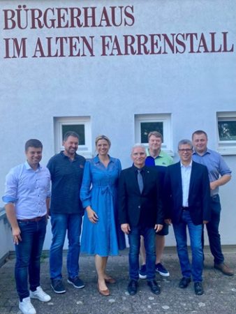 Foto: Sarah Schweizer bei einem Besuch des Farrenstalls in Schlierbach vor zwei Wochen mit Bürgermeister Sascha Krötz (links),dem Vorsitzenden des CDU-Ortsverbands Marco Emmert (2. v. r.) sowie Vertretern des Gemeinderats
