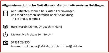 HaiPressDerzeit wird in den Medien über die Schließung von Notfallpraxen der Kassenärztlichen Vereinigung in Baden-Württemberg berichtet. Diese Notfallpraxen stehen jedoch in keinem Zusammenhang mit der Allgemeinmedizinischen Notfallpraxis des ALB FILS KLNIKUMS im Gesundheitszentrum in Geislingen.