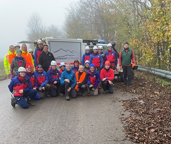 Namen auf dem Gruppenbild: Teilnehmerinnen und Teilnehmer der Müllsammelaktion mit dem Lautersteiner Bürgermeister Michael Lenz (kniend,Warnweste),dem Ersten Landesbeamten des Landkreises Göppingen Jochen Heinz (stehend,schwarze Jacke),dem Leiter des Umweltschutzamts Jupp Jünger (kniend,hellblaue Jacke),Vertretern des Abfallwirtschaftsbetriebs (links außen stehend: dem Sachgebietsleiter Wertstoffsammelstellen Matthias Wiedmann) sowie zahlreichen Helferinnen und Helfern der DRK-Bergwacht Göppingen um Einsatzleiter Martin Stollstein (hinten,Zweiter von rechts) und des Schwäbischen Albvereins,Ortsgruppe Weißenstein,um den stellvertretenden Vorsitzenden Erich Distel (kniend,blaue Mütze).