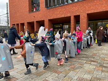 Beschwingt und fröhlich legten die Kinder gemeinsam mit den verkleideten Rathausmitarbeiterinnen und -mitarbeitern noch eine flotte Sohle auf das Schlossplatz-Parkett.