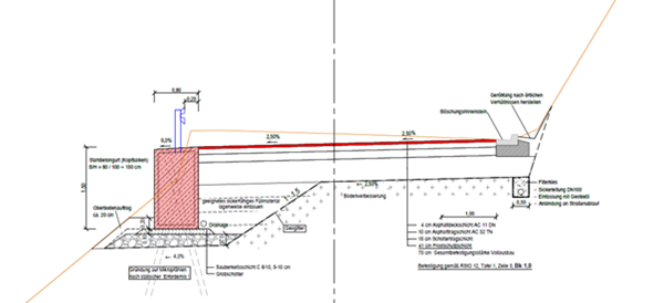 Auf Grund der Ausführungsplanung für die Ingenieurbauwerke mussten unter Berücksichtigung der geologischen Verhältnisse,die Verankerungen in einem engeren Abstand gesetzt werden. Zudem wurden Schrägpfähle angeordnet,um bei einem Anprall auf die Schutzeinrichtung ein Kippen der Balken zu verhindern. Dadurch entsteht ein höherer Aufwand für die Herstellung der Schalung durch den Einbau von zusätzlichen Durchdringungen.