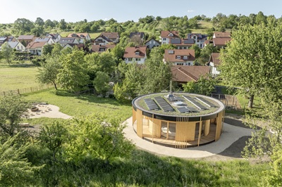 Der Holzbau in runder Ausführung beeindruckte die Jury „durch seine harmonische Integration in die hügelige Landschaft am Rande der Schwäbischen Alb. Die wiederkehrenden runden Formen,die sich in den Dachfenstern und in den Außenanlagen widerspiegeln,tragen zur einheitlichen Ästhetik bei. Das Gebäude strahlt eine warme Atmosphäre aus,die sofort ein Gefühl des Wohlbefindens und der Ankunft vermittelt. Es demonstriert eindrucksvoll,wie man mit einfachen und nachhaltigen Mitteln ein wahres Highlight für Kinder schaffen kann. Eine vorbildliche Investition in die Zukunft – unsere Kinder.“ So die Begründung der Jury.