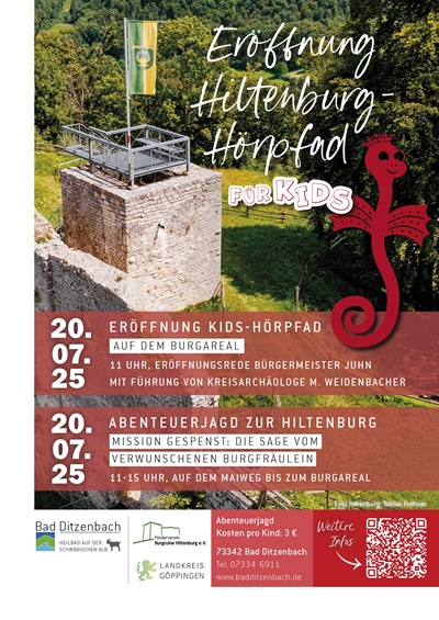 Zur offiziellen Eröffnung des Kids-Hörpfads lädt die Gemeinde Bad Ditzenbach am Sonntag,20. Juli 2025 herzlich ein. Ein besonderes Highlight: Auf alle Kinder wartet eine spannende Abenteuerjagd zur Hiltenburg.