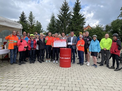 Foto (Bildquelle: Stadt Eislingen): Bei ihrem Stopp in Eislingen überreichte Oberbürgermeister Klaus Heininger den Radlerinnen und Radlern der ‚Tour de Kreisle‘ eine Spende in Höhe von 300 Euro.