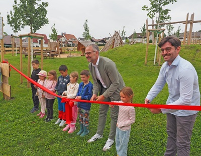 Foto  (Stadt Uhingen): Ortsvorsteher Vincent Krapf (rechts) und Bürgermeister Matthias Wittlinger eröffnen den neuen Spielplatz mit tatkräftiger Unterstützung einiger Kindergartenkinder.