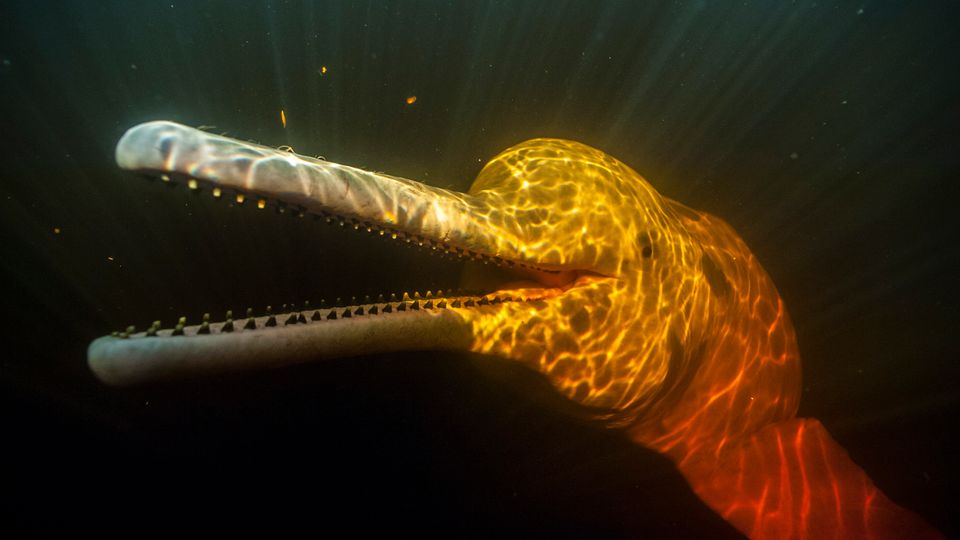 Ein Delfin im Amazonas: Was hier im Licht orange erscheint,ist tatsächlich eine rosa Färbung
