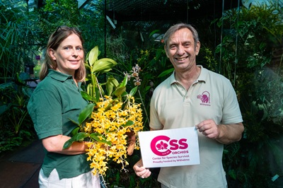 Foto (Wilhelma Stuttgart/Birger Meierjohann): Stefanie Reska,Leiterin der Stabsstelle Artenschutz und Dr. Thomas Kölpin,Direktor der Wilhelma,inmitten von Orchideen in der historischen Gewächshauszeile der Wilhelma.