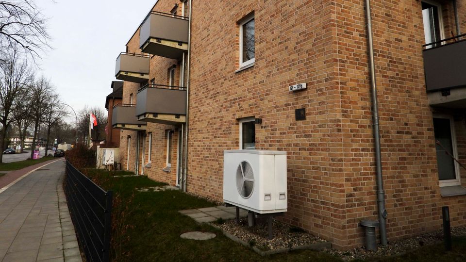 Wärmepumpe vor einem Mehrfamilienhaus: Hilfreich auch für ältere Gebäude