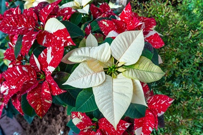 In der Natur entwickelt der bis zu vier Meter hohe Strauch während der trockenen Wintermonate seine auffällige Färbung. Bei den vermeintlichen „Blütenblätter“ handelt es sich allerdings in Wirklichkeit um Hochblätter,sogenannte Brakteen,die sich rund um den unscheinbaren,gelbgrünen Blütenstand gruppieren. Die Blüte und damit auch die besondere Farbgebung der Brakteen setzt als Reaktion auf kurze Tageslängen ein. Dafür sind mehrwöchige Dunkelphasen von mindestens zwölf Stunden pro Tag notwendig. Durch gezielte Steuerung der Lichtphasen,z. B. indem man die Pflanze sechs bis acht Wochen vorher jeden Abend in einen dunklen Raum bringt,kann man den Zeitpunkt der Blüte beeinflussen. Während die Brakteen der Wildform in einem kräftigen Rot erstrahlen,wurden durch Züchtungen viele weitere Variationen erschaffen. In der Wilhelma reicht die Farbpalette von zartem Weiß über Lachsrosa,verschiedene Pastelltöne,leuchtendem Pink und sattem Rot bis zu zweifarbigen Varianten mit marmorierten Mustern.