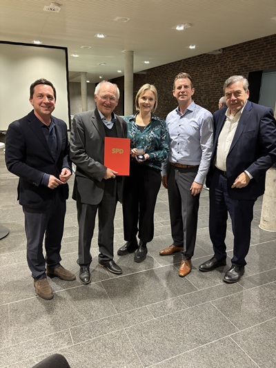 Den feierlichen Abschluss bildete die Verleihung der Willy-Brandt-Medaille,eine der höchsten Auszeichnungen der SPD. Überreicht wurde sie gemeinsam von Sabrina Hartmann (Kreisvorsitzende),Andre Knaus (Ortsvereinsvorsitzender),Sascha Binder (Generalsekretär,MdL) und Siegmar Mosdorf. Die Ehrung würdigt Hofelichs langjähriges Engagement,seine politische Haltung und seine Verdienste um die Sozialdemokratie in Baden-Württemberg. Peter Hofelich dankte in ihm eigener Art durch einige wenige Anekdoten,die seinen bisherigen beruflichen und politischen Weg ebenso humorig wie nachdenklich beschrieben. Der Abend klang danach bis in die späten Stunden bei guten Gesprächen im Foyer der Stauferlandhalle aus.